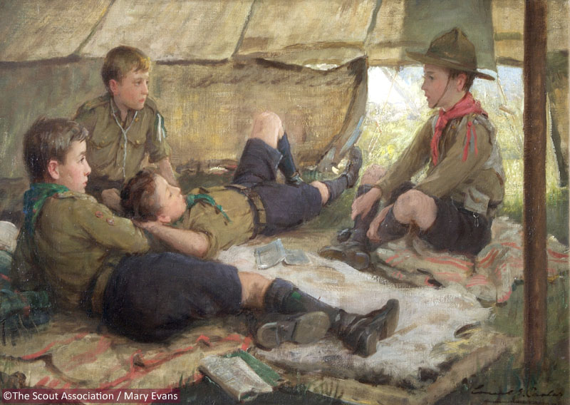 Nostalgic posters remind us of the annual 'Bob-a-Job Week' while the association's collection of art includes many examples by Baden-Powell himself who was an able and prolific artist. A particular highlight is the work of Ernest Stafford Carlos, who founded his own South London scout troop, and produced paintings such as 'Ripping Yarn' and 'The Pathfinder' that were to disseminate the image and ethos of the boy scout movement to the wider public in its early days. He was killed during the Battle of Messines in 1917.